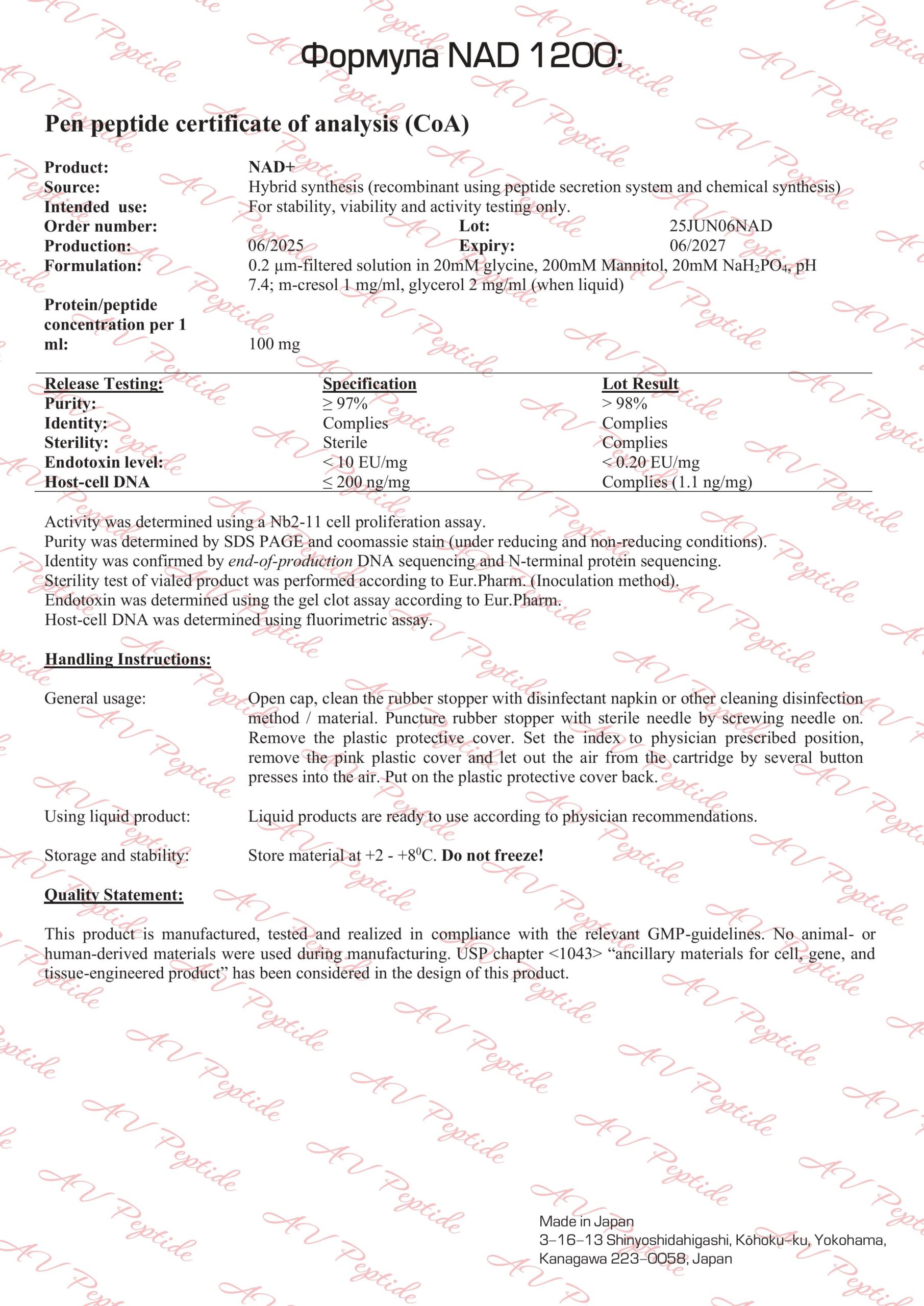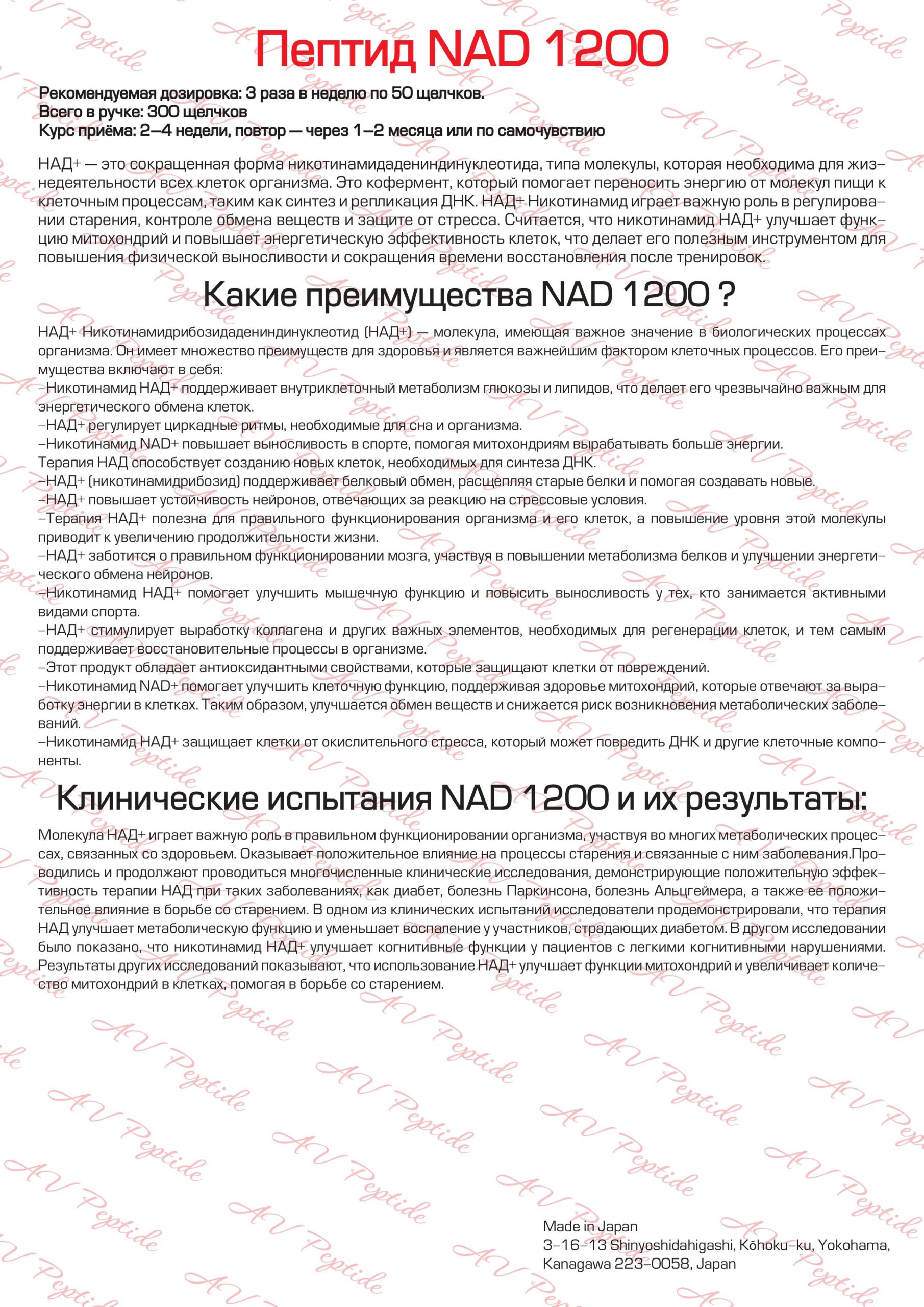 NAD+ (Нікотинамідаденіндинуклеотид) — це коензим, який природно присутній у кожній клітині організму та відіграє ключову роль у виробленні енергії, регенерації клітин та підтримці молодості. Препарат у формі готової до використання ін’єкційної ручки AV Peptide (Японія) забезпечує швидке засвоєння і високу біодоступність діючої речовини.