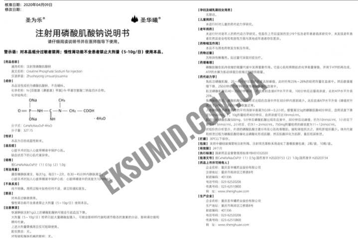 Через 40 хвилин після краплинної інфузії 5 г препарату сироваткові рівні фосфокреатину падають нижче 5 нмоль/мл, а після введення 1 г препарату вони становлять приблизно 10 нмоль/мл.