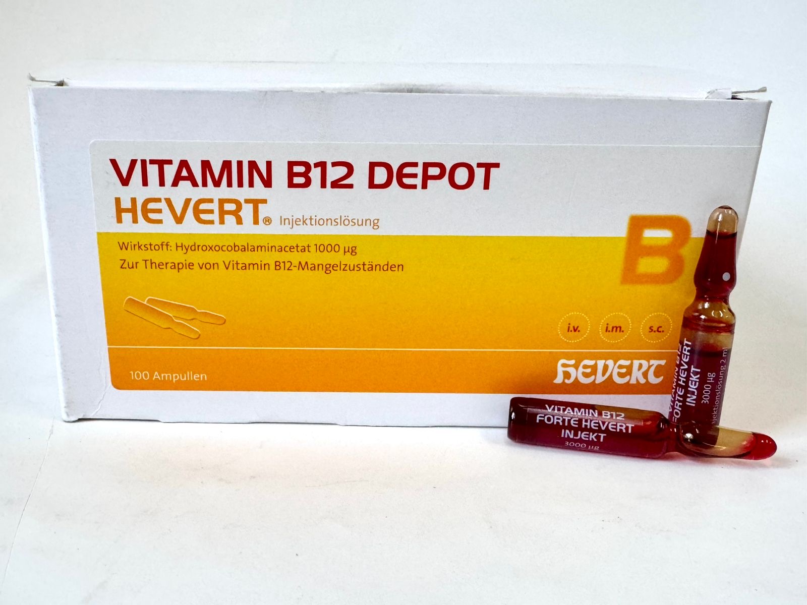 Якщо не зазначено інше, 1 мл «Вітаміну В12 Депо Хеверт» (еквівалентно 500 мкг гідроксокобаламіну ацетату) вводять двічі на тиждень на початку лікування в перші кілька тижнів після встановлення діагнозу. При доведеному порушенні всмоктування вітаміну В12 у кишечнику вводять 100 мкг гідроксокобаламіну ацетату 1 раз на місяць.
